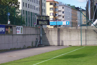 This is the game in progress, with the HJK Helsinki stadium behind.