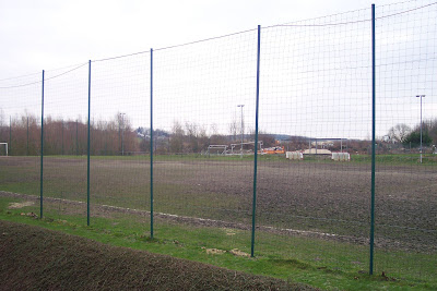 Through netting on the other side we look across the pitch to the grass banking opposite.