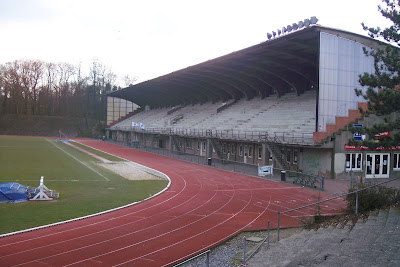 When I looked at this ground in February 2009 I couldn't see any mention of which club used it as their ground, & it was through his Facebook group that I know it is RRC Boitsfort. They appear to play at the second level of the local Brussels area leagues. I'm not a fan of running track grounds for football, as regulars will know, but this one has some magnificent old terracing, as you will see.