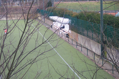 Behind the stand is an all weather pitch, & other open air sports facilities. I don't know, but presume, this is part of the same complex. I didn't go down to this pitch, but took a couple of snaps from the footpath above it. Railed off down one side, with a small stand in the middle.