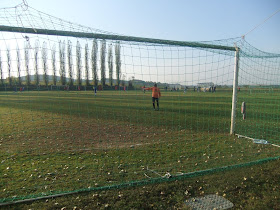 Looking down the pitch ,through an old training goal.